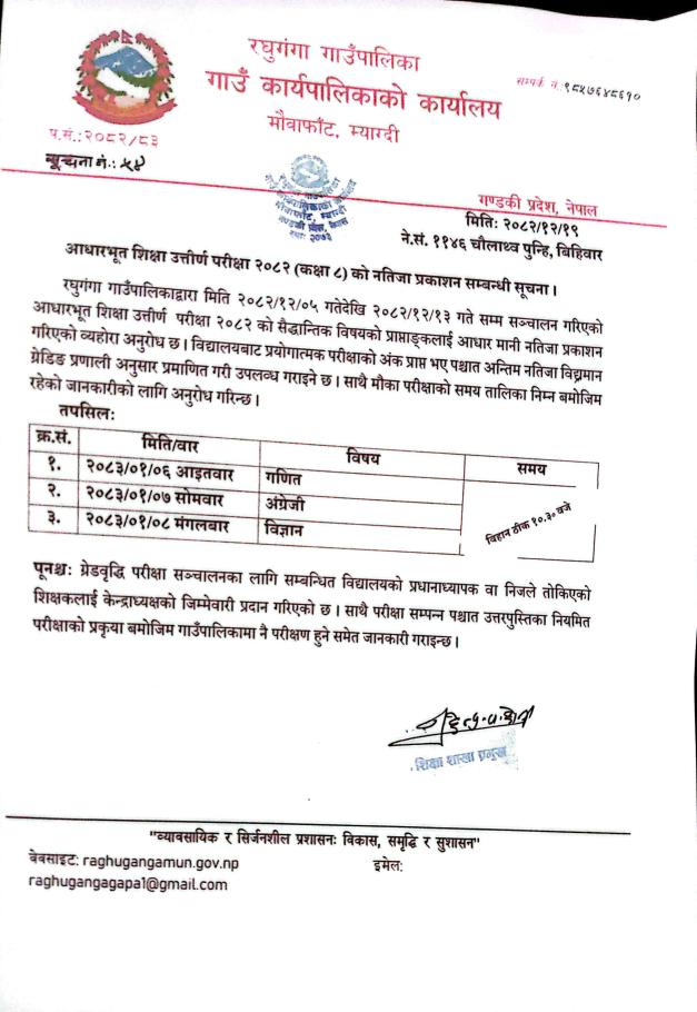आधारभूत शिक्षा उत्तीर्ण परीक्षा २०८२ (कक्षा ८) को नतिजा प्रकाशन सम्बन्धी सूचना ।