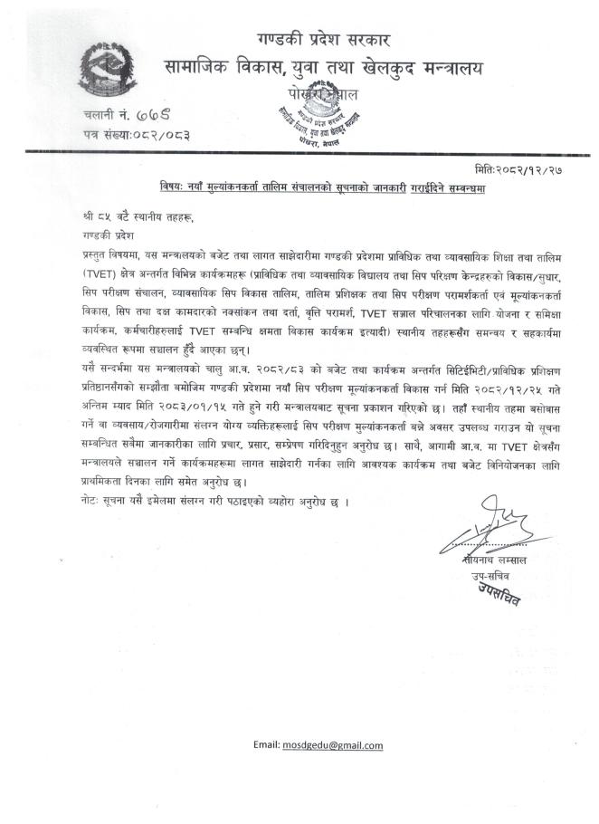 नयाँ मुल्यांकनकर्ता तालिम संचालनको सूचना सम्वन्धमा !!!