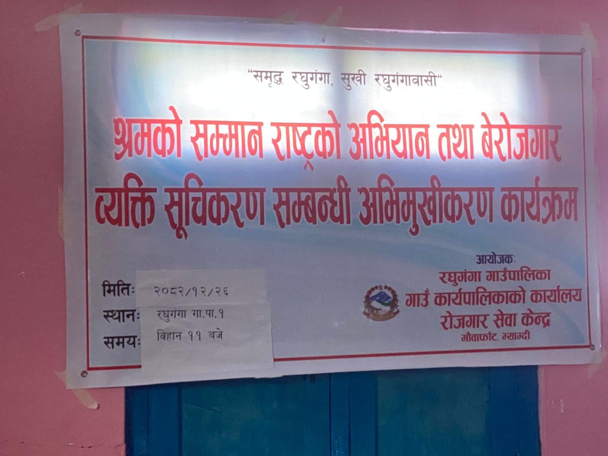 मिति २०८२-१२-२६ र २७ गते वडा नं. १ र २ मा “श्रमको सम्मान राष्ट्रको अभियान” तथा बेरोजगार व्यक्ति सूचिकरण सम्बन्धी अभिमुखीकरण कार्यक्रम सफलतापूर्वक सम्पन्न भयो। सहभागीहरूमा धन्यवाद !!!
