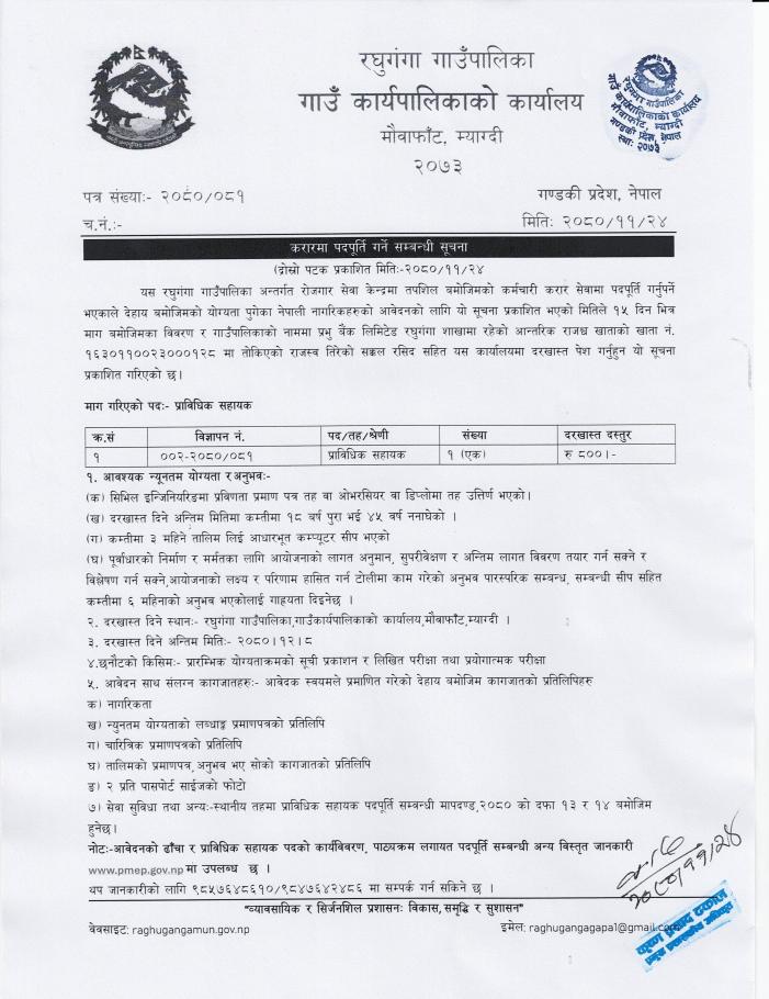सेवा करारमा कार्यालय सहयोगी पदपूर्ती गर्ने सम्बन्धी सूचना ।।।