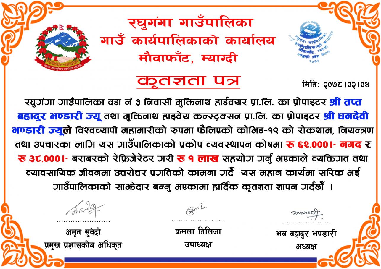 कृतज्ञता पत्र l (श्री तप्त बहादुर भण्डारी)