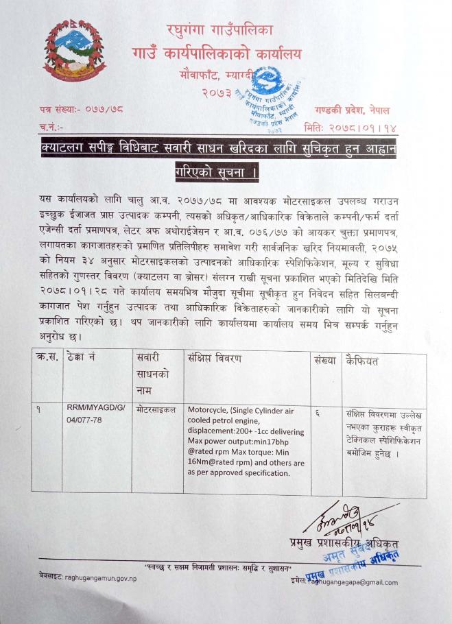 क्याटलग सपीङ्ग विधिबाट सवारी सााधन खरिदका लागि सुचिकृत हुन आह्वान गरिएको सूचना l