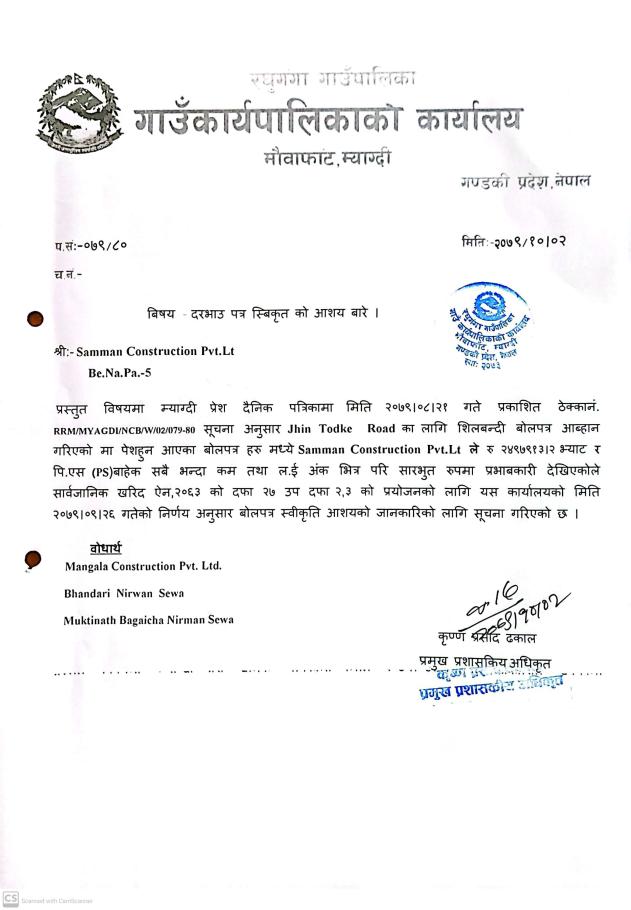 Raghuganga Rural Municipality invites Electronic bids from Nepalese eligible bidders for the construction of Rakhu Bega Roads Construction .