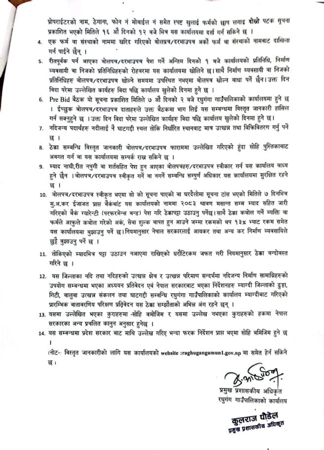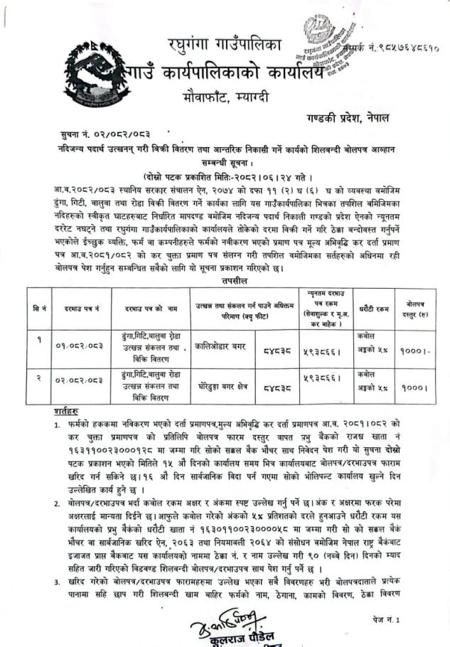 नदिजन्य पदार्थ उत्खनन् गरी बिक्री वितरण तथा आन्तरिक निकासी गर्ने कार्यको शिलबन्दी बोलपत्र आव्हान सम्बन्धी सूचना !!!(दोस्रो पटक प्रकाशित )