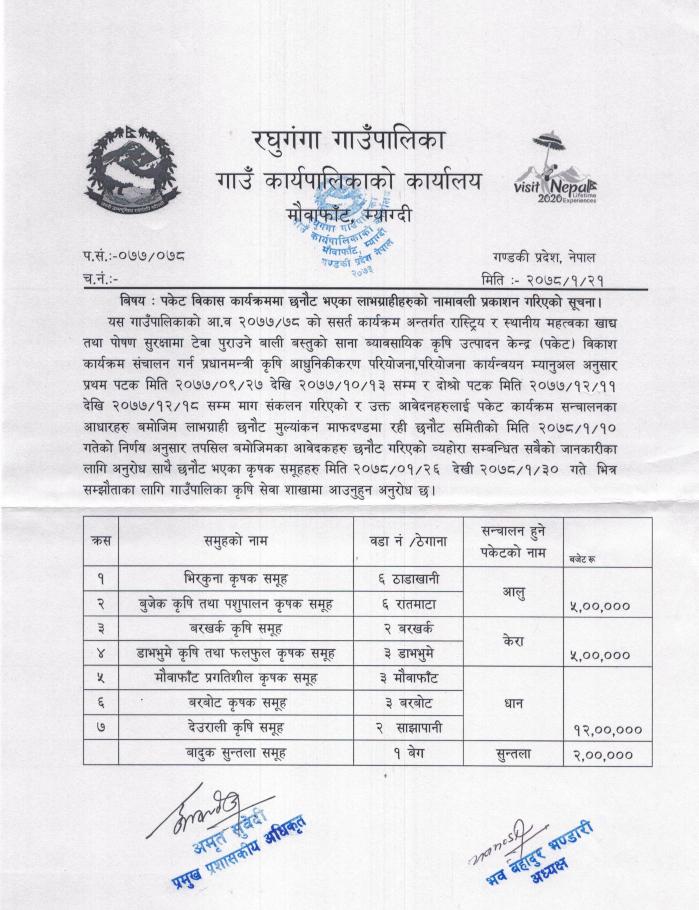 पकेट विकास कार्यक्रममा छनौट भएका लाभग्राहीहरूको नामावली प्रकाशन गरिएको सूचना ।