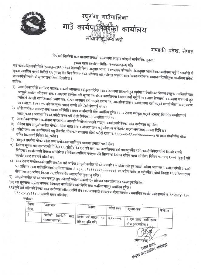 » पिप्लेको तिल्केनी सटर भाडामा लगाउने सम्बन्धमा आह्वान गरिएको सार्वजानिक सूचना