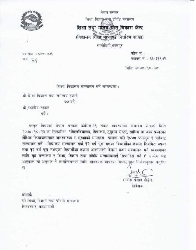 भाैतिक उपस्थितिमा विद्यालय सञ्चालन हुने सम्बन्धी सूचना