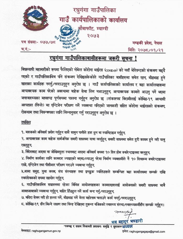 रघुगंगा गाउँपालिकावासीहरूमा जरूरी सूचना ।