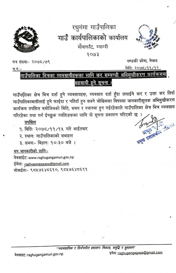 » रघुगंगा गाउँपालिका भित्रका व्यावसायीहरुका लागि कर सम्बन्धी अभिमुखीकरण कार्यक्रममा सहभागी हुने सूचना l