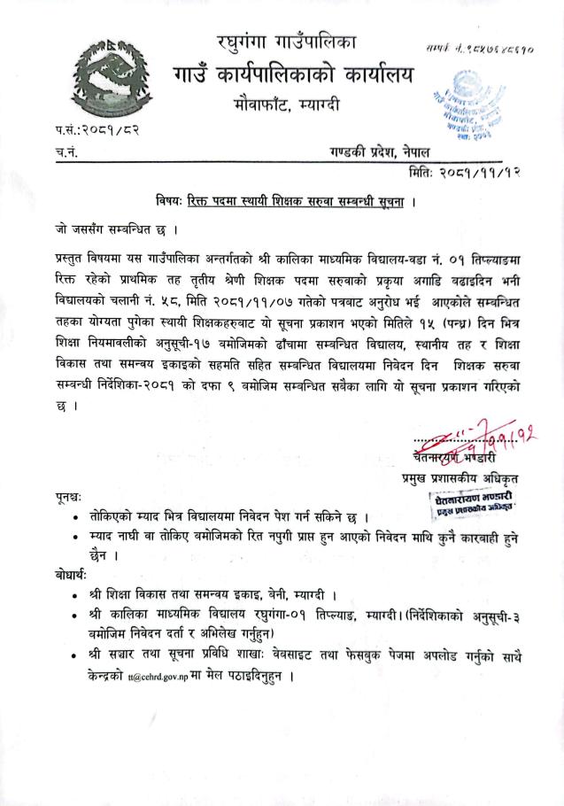 रिक्त पदमा स्थायी शिक्षक सरुवा सम्बन्धी सूचना ।