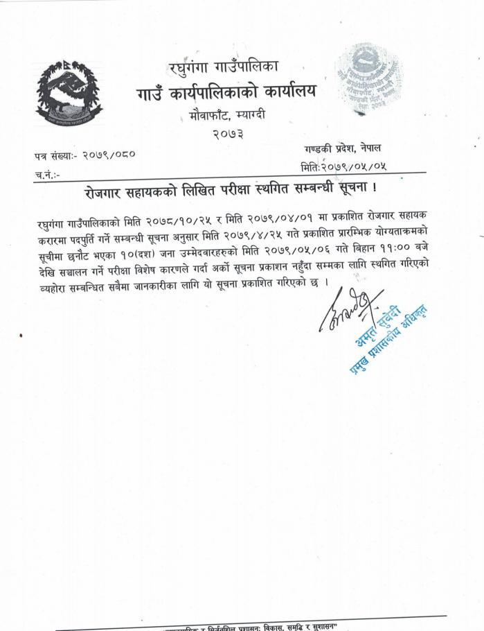 रोजगार सहयकको लिखित परीक्षा स्थगित सम्बन्धी सूचना ।