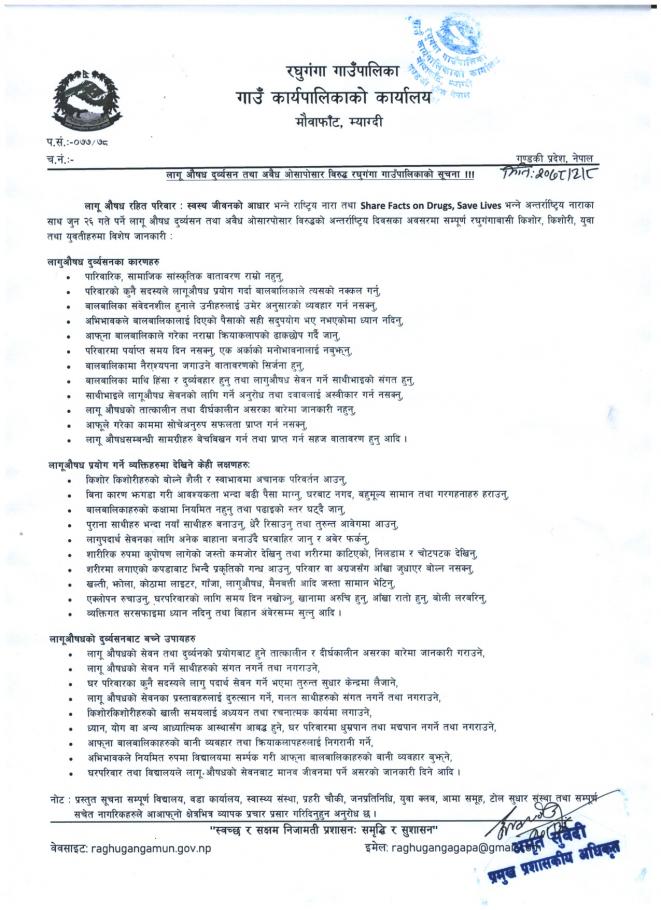 » लागू औषध दुर्व्यसन तथा अवैध ओसार पोसार विरूद्ध रघुगंगा गाउँपालिकाको सूचना ।
