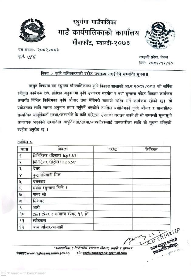 » विषय :- कृषि यन्त्रिकरणको दररेट उपलब्ध गराईदिने सम्बन्धि सूचना !!!