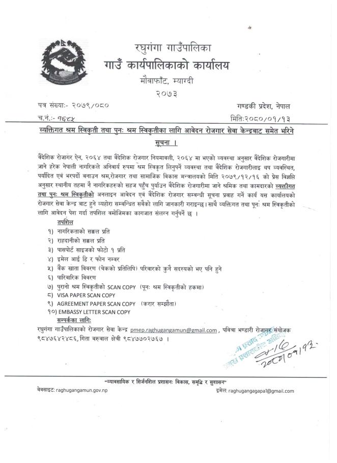 व्यक्तिगत श्रम स्विकृती तथा पुनः श्रम स्विकृतीका लागि आवेदन रोजगार सेवा केन्द्रबाट समेत भरिने सूचना ।