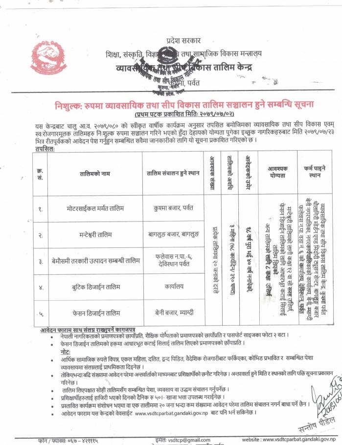 व्यवसायिक तथा सीप विकास तालीम केन्द्र, पर्वतको सूचना ।