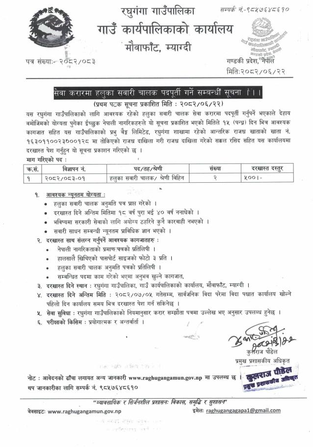 सेवा करारमा हलुका सवारी चालक पदपूर्ती गर्ने सम्बन्धी सूचना !!!