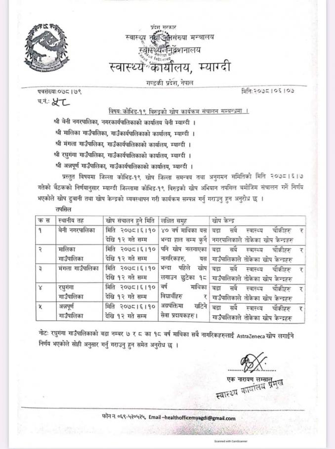 स्वास्थ्य कार्यालय म्याग्दीको कोभिड-१९ बिरुद्धको खोप कार्यक्रम संचालन सम्बन्धमा l
