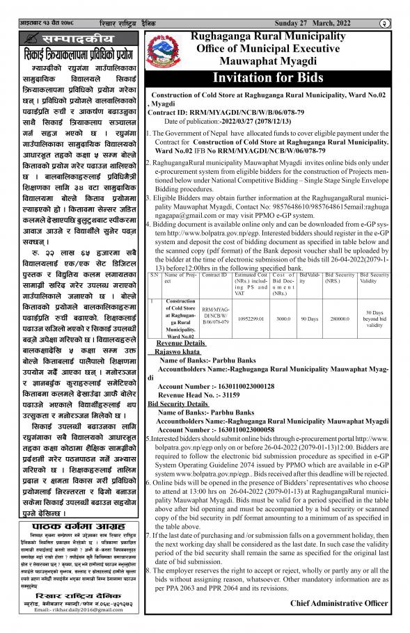 » Invitation for bids of Construction of Cold Store At Raghuganga Rural Municipality Ward No.2 IFB No RRM/MYAGDI/NCB/W/06/07/078-79