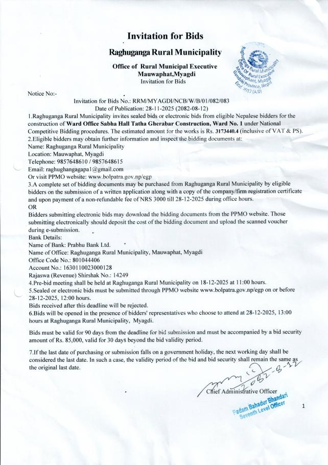 » Invitation for Bids of Ward office Sabha Hall Tatha Gherabar Construction Ward.1