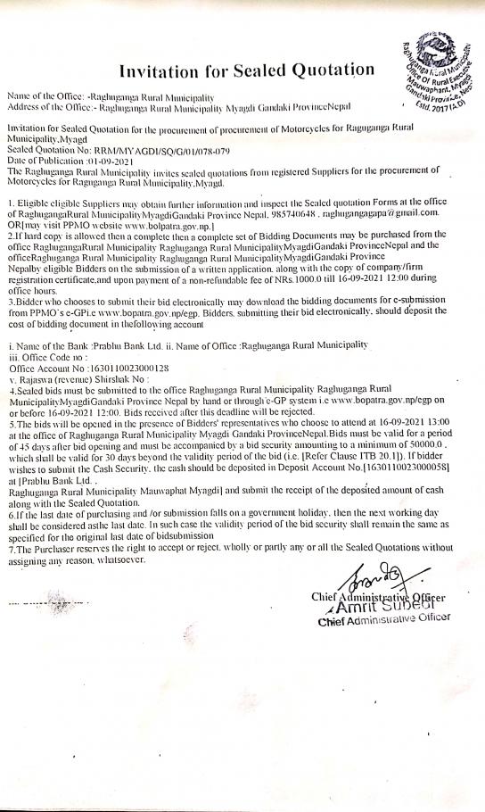 Invitation for Sealed Quotation for the procurement of Motorcycles of Raghuganga Rural Municipality